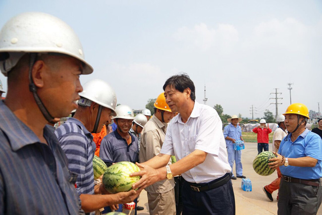 8月3日上午,新安縣產(chǎn)業(yè)集聚區(qū)管委會副主任牛志偉一行帶著西瓜、礦泉水等防暑降溫物品,到萬基控股集團2×60萬千瓦機組工程建設(shè)工地慰問施工人員??偨?jīng)理郭峰陪同。
