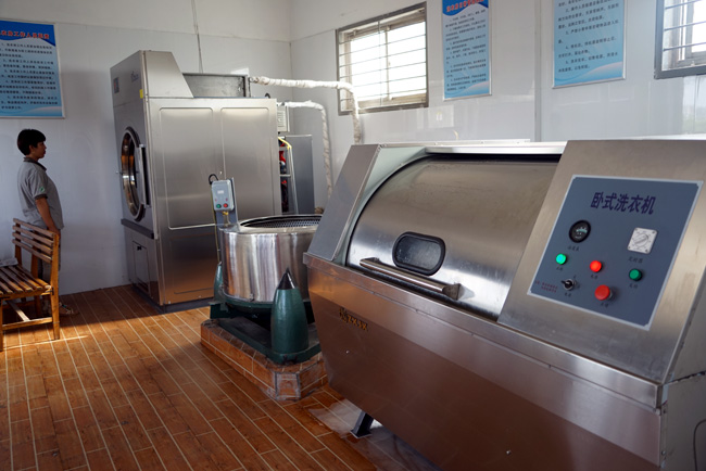 生產(chǎn)一線員工工作服臟得較快,有的在單位換洗,有的穿回家換洗,還有的懶于換洗,個別崗位由于工作環(huán)境較差,上班汗津津,下班臟兮兮,穿著不舒服,感覺不體面、無尊嚴。在管理提升、對標學(xué)習活動中,集團公司工會受中信重工集團管理經(jīng)驗的啟發(fā),提出了建設(shè)洗衣房、為職工免費洗衣的建議。李躍民董事長在聽取匯報后,當即拍板確定洗衣房建設(shè)方案,郭峰總經(jīng)理到現(xiàn)場查看后,確定先在一鋁、二鋁建設(shè)試點,再在發(fā)電、鋁加工等單位推廣。工會、工程管理部、貿(mào)易公司經(jīng)過多次考察論證,從硬件設(shè)施到軟件管理,定方案、出措施,利用鋁業(yè)一公司門崗閑置房進行土建、電氣、供水、供汽改造,經(jīng)過為期一周的緊張施工,洗衣房土建改造和設(shè)備安裝全部結(jié)束,共安裝70公斤滾筒式工業(yè)洗衣機、蒸汽烘干機和甩干機各1臺,配備專用洗衣液和消毒液,對工作服統(tǒng)一編號、分類洗滌、烘干消毒,讓職工穿得干凈體面,工作開心舒心。